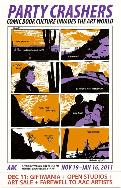 THE SHOW: PARTY CRASHERS mashes up comic art and contemporary gallery culture, and features artists who pass back and forth between the two worlds. This massive two venue show results from a crosstown collaboration between AAC Director of Exhibitions Jeffry Cudlin and Artisphere Gallery Director Cynthia Connolly. The show’s two independent halves feature different types of work: Connolly’s show presents fine artists who mimic the appearance of comic art; Cudlin’s show at AAC contains: