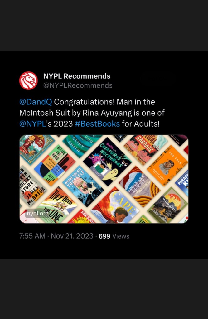 The New York Public Library (NYPL) has named The Man in the McIntosh Suit one of its Best Books of 2023 and Top 10 Graphic Novels for Adults! A huge thank you to all the NYPL librarians and staff for their tireless efforts supporting and spreading their love of books and comics all the year through!